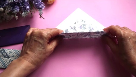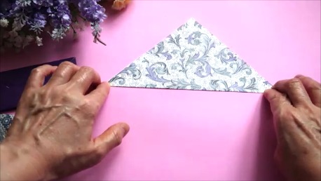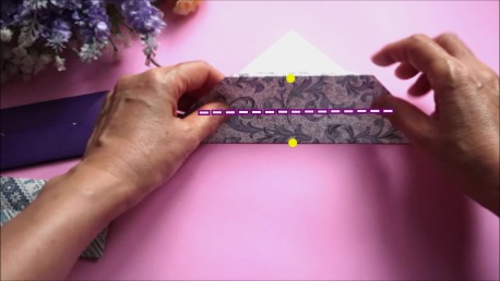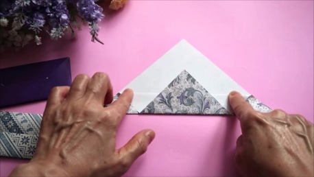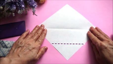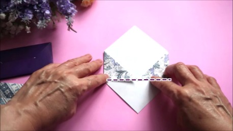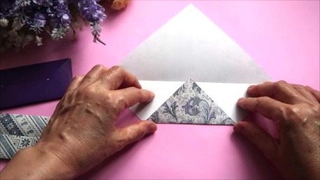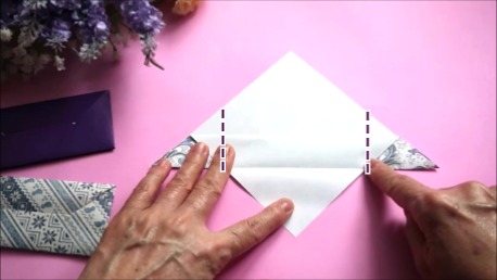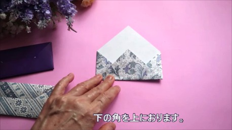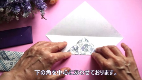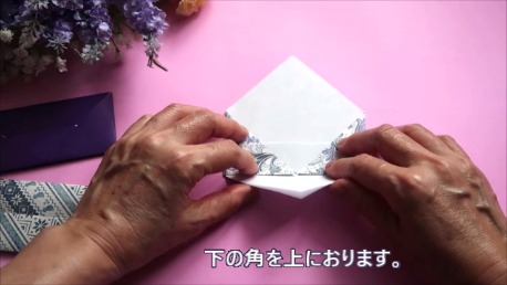 下の先の部分を広げた状態でもちあげ、折りすじと折りすじを
