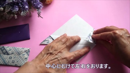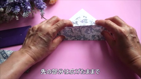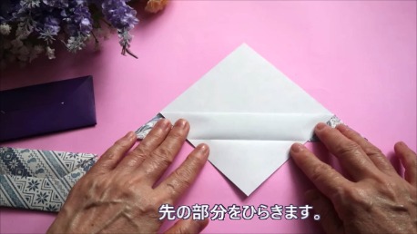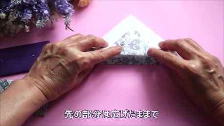 2つ目は 先の部分をひらいた状態で折りすじと折りすじを