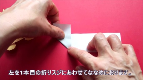 左を1本目の折り筋に合わせて斜めに折ります。