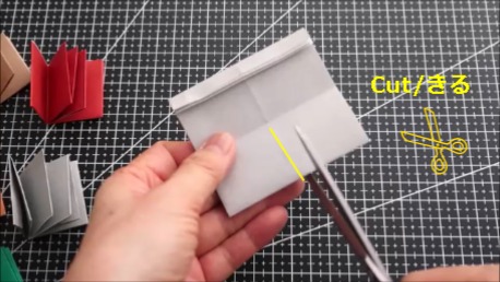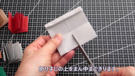 折り筋の上を真ん中まで切ります。