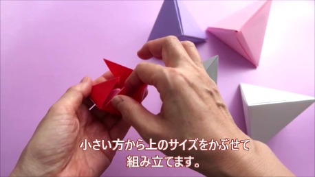 かぶせるように次の大きさのトライアングルをかぶせてから組み立てます。